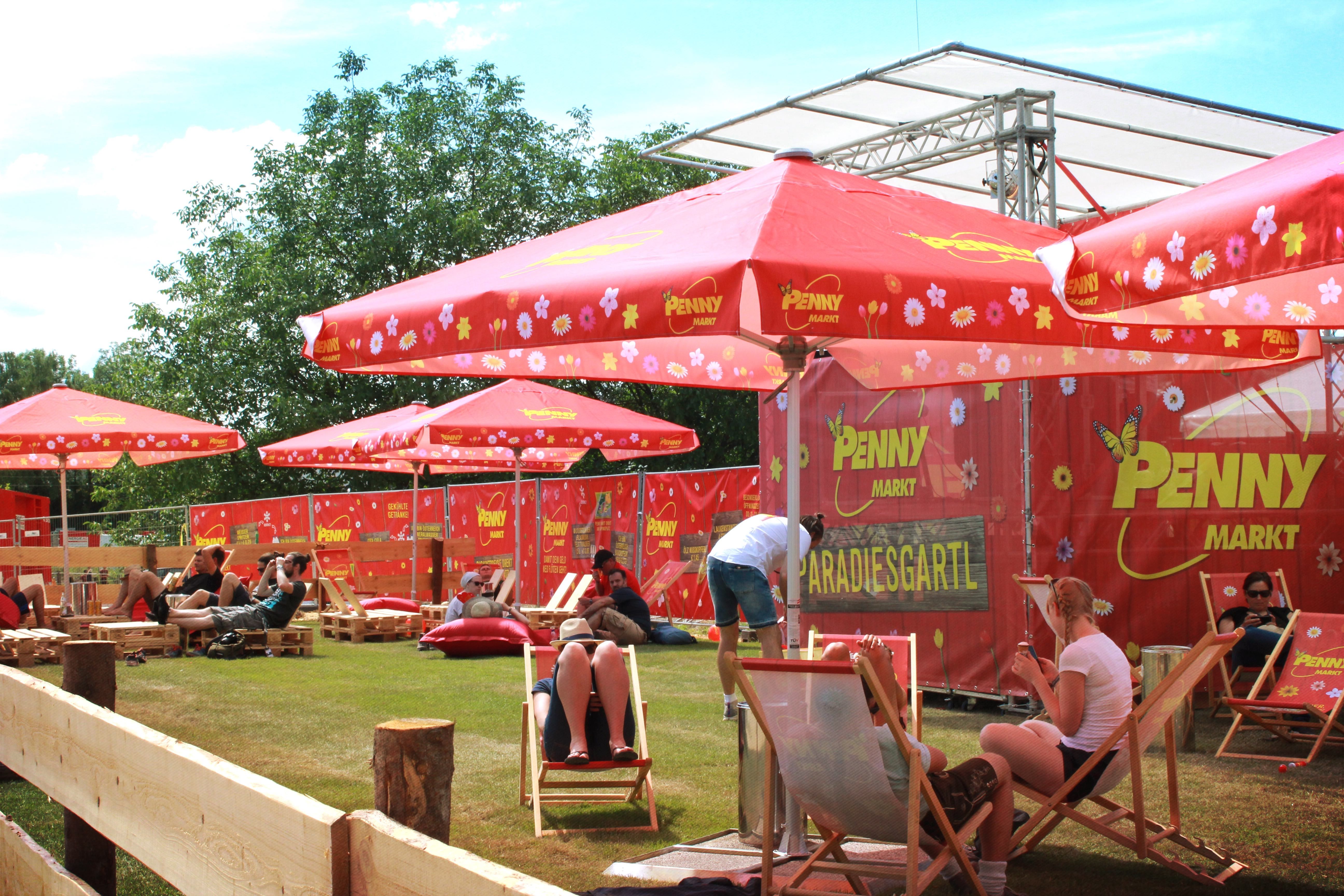 Beim Woodstock Festival der Blasmusik inszenierten wir für Penny eine Chill-Out-Lounge. Ganz im Sinne des Festival-Namens setzten wir auf florale Muster, viel Holz und in Mundart geschriebene Texte. Umgesetzt wurde das „Paradiesgartl“ mit Liegestühlen, einem DJ-Pult, einer Grillstation, Rollrasen, Sonnenschirmen und einer Fotobox. Snacks von Penny und die gemütliche, urige Atmosphäre luden zum Entspannen ein. Um Penny noch besser zu bewerben, setzten wir auf zusätzliche Werbemittel wie Penny-Fächer, Wasserbälle, Seifenblasen, einen riesigen Heliumballon und ein Riesenrad-Branding.