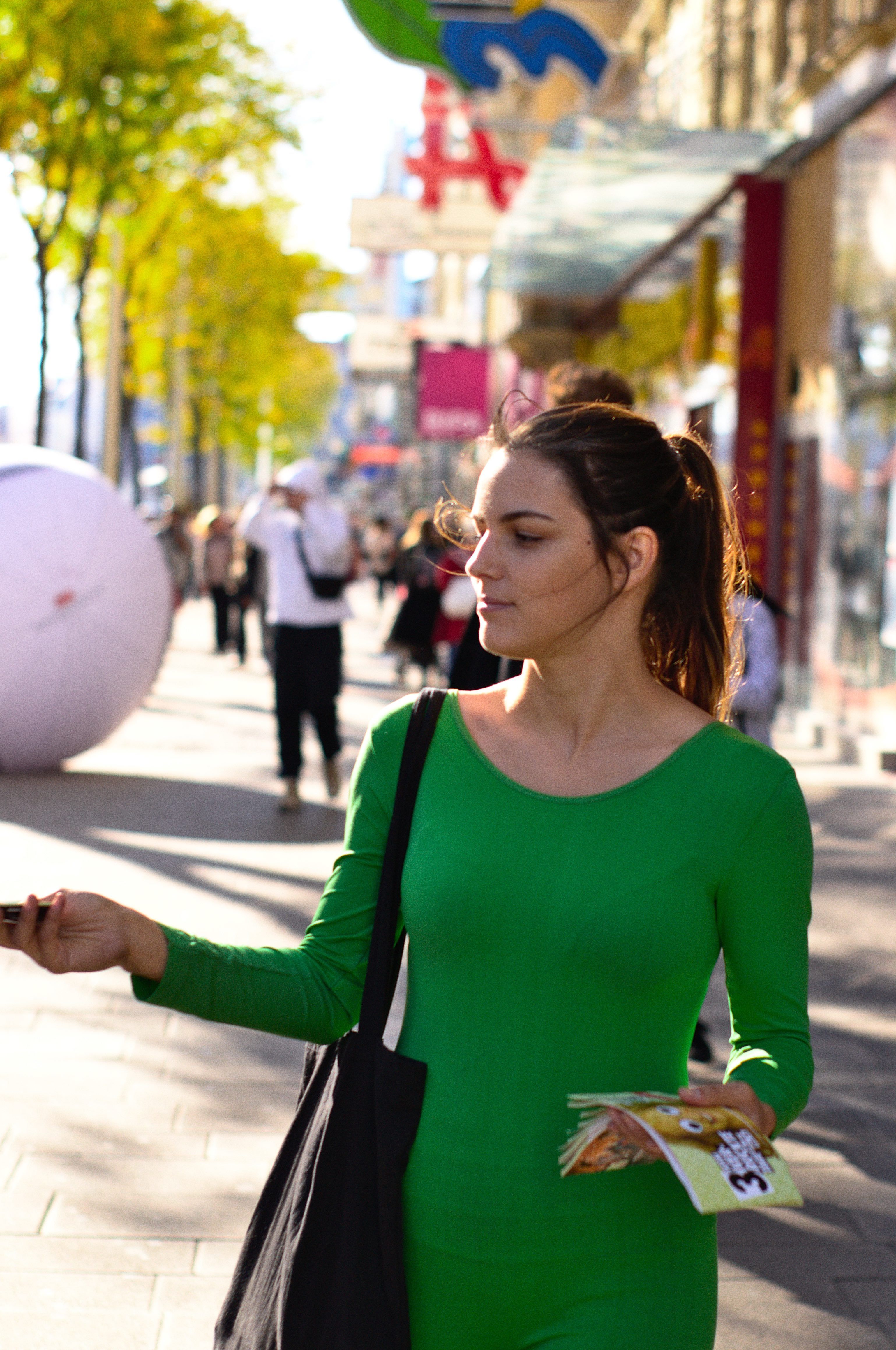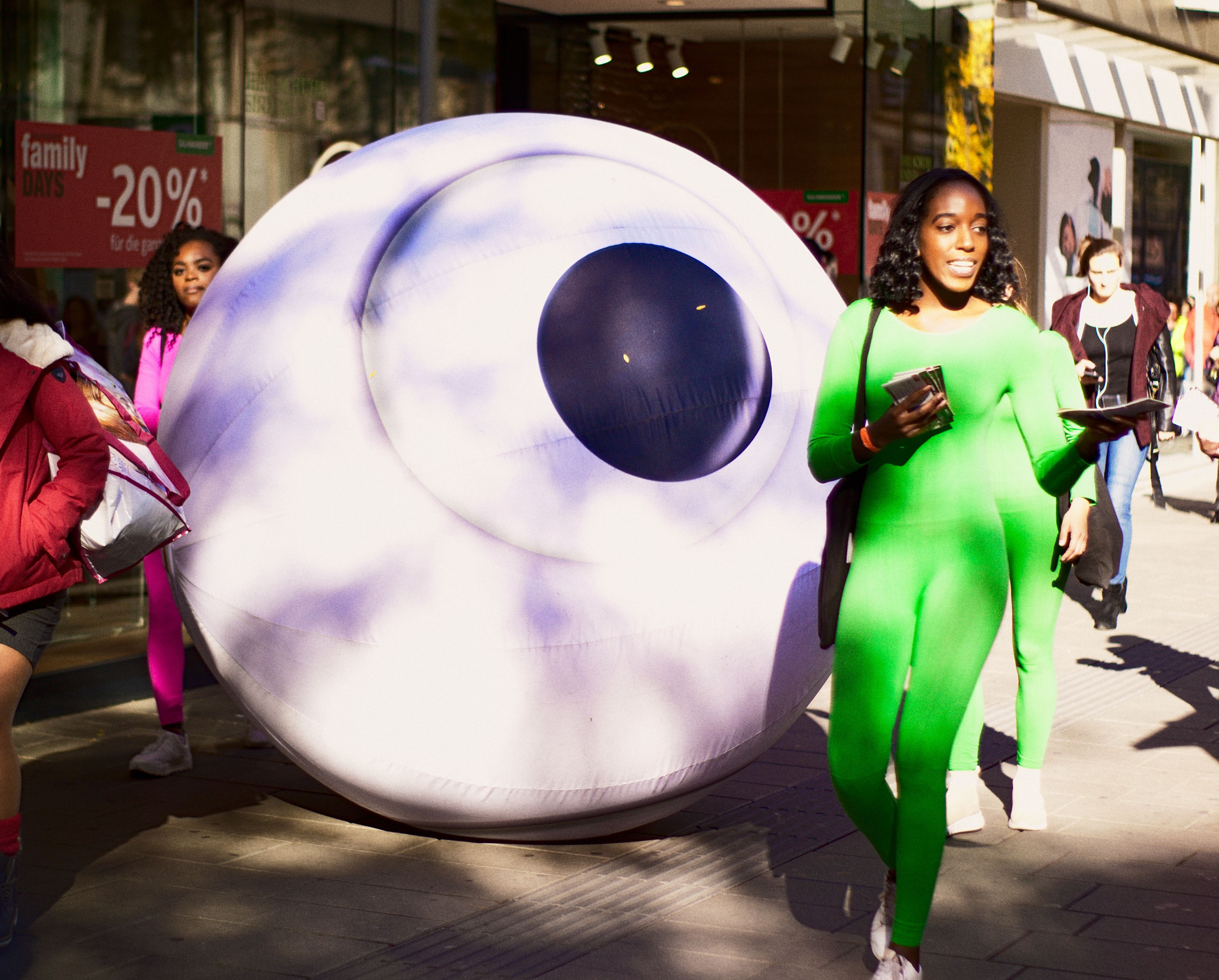 Bei den "Verrückten Tagen" ließen wir für Gerngross Bodysuits für unsere Promotoren in grün und pink anfertigen, in denen sie eine Riesenkugel in Form eines Auges mit zwei Meter Durchmesser über die Mariahilfer Straße rollten.