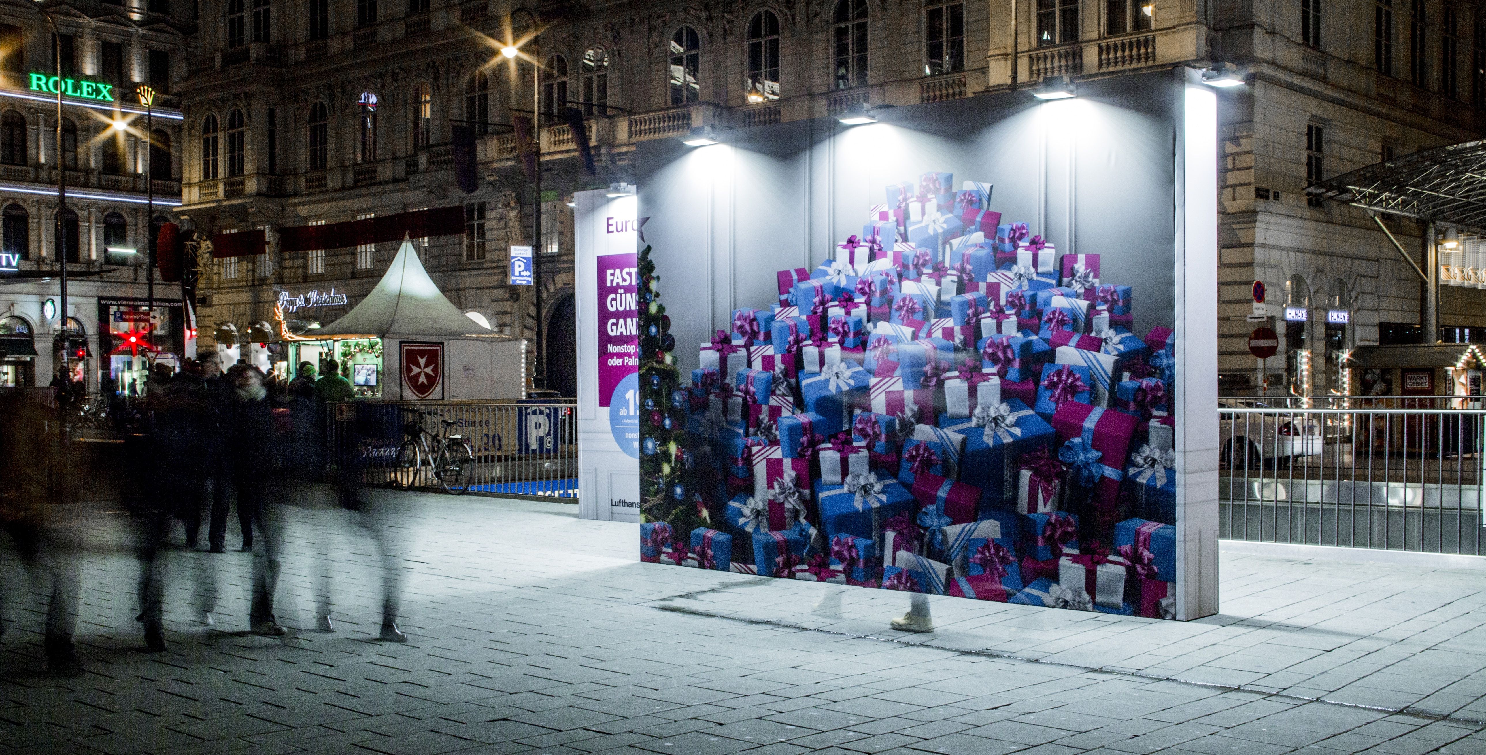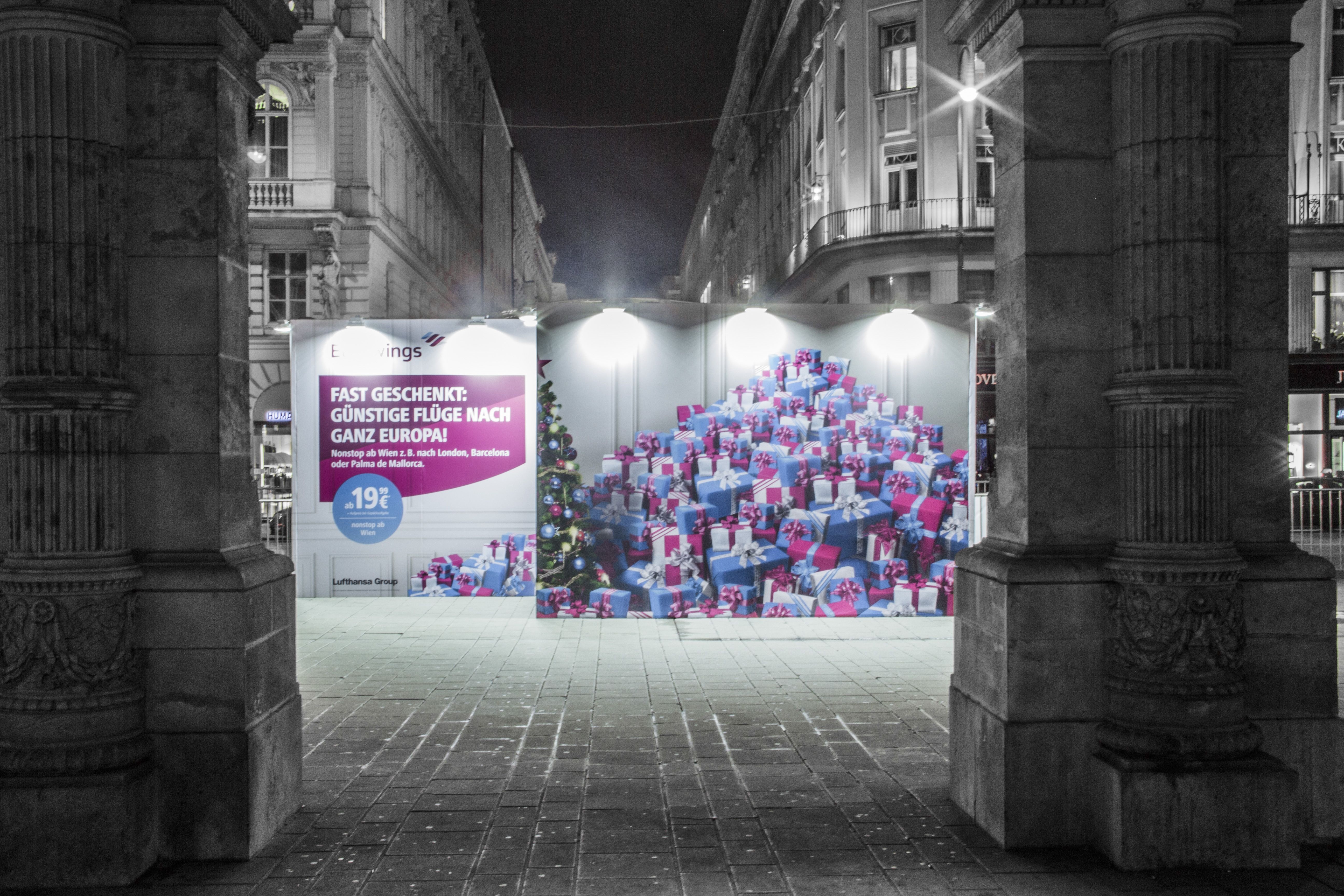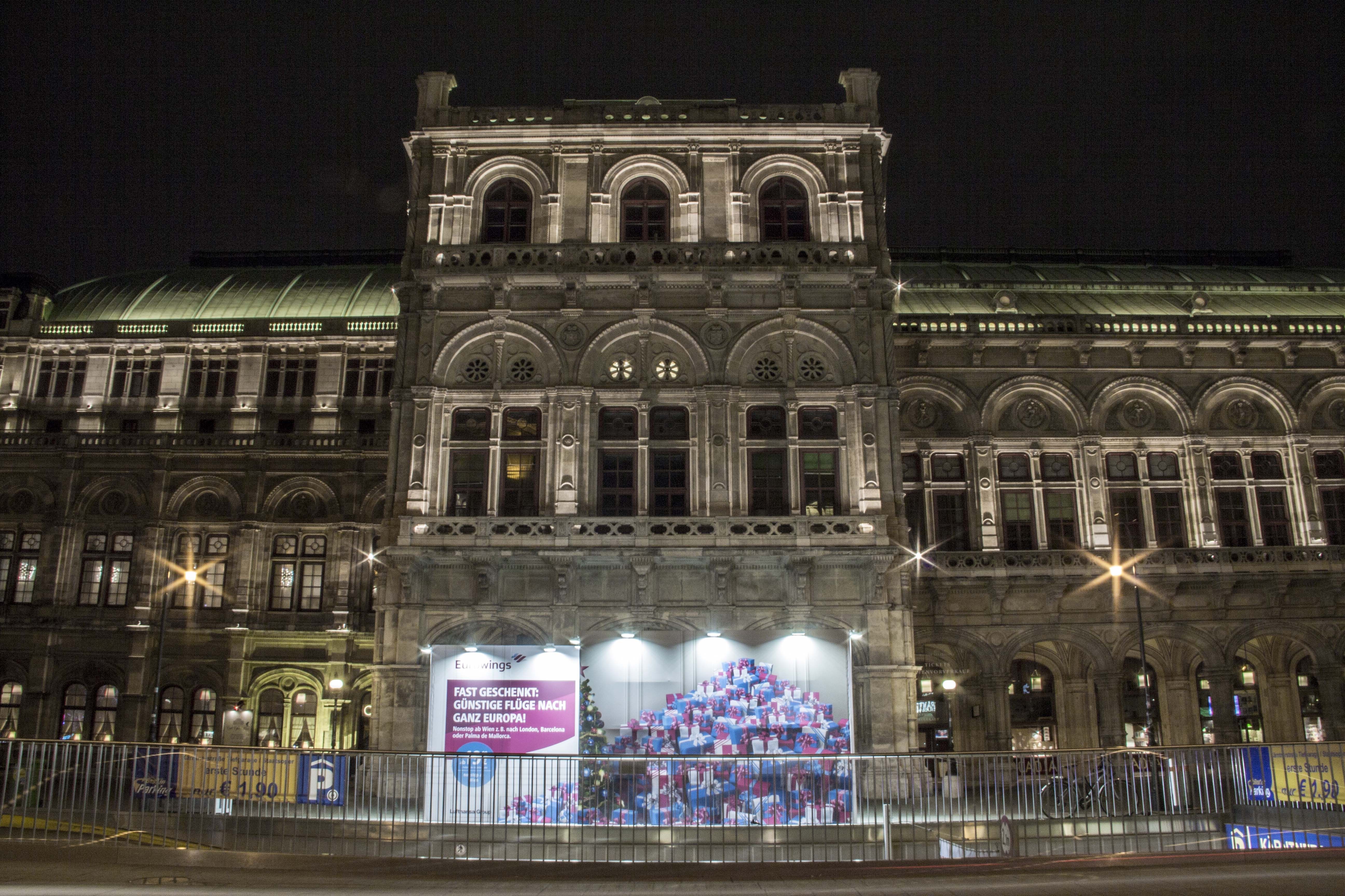 Das Schönste an Weihnachten sind doch die Geschenke. Mit Eurowings fliegt es sich fast geschenkt nach ganz Europa. Wir zählten eins und eins zusammen und bewarben um die Weihnachtszeit direkt vor der Wiener Staatsoper die sagenhaft günstigen Europaflüge von Eurowings – dabei setzten wir natürlich auf reichlich Geschenke.