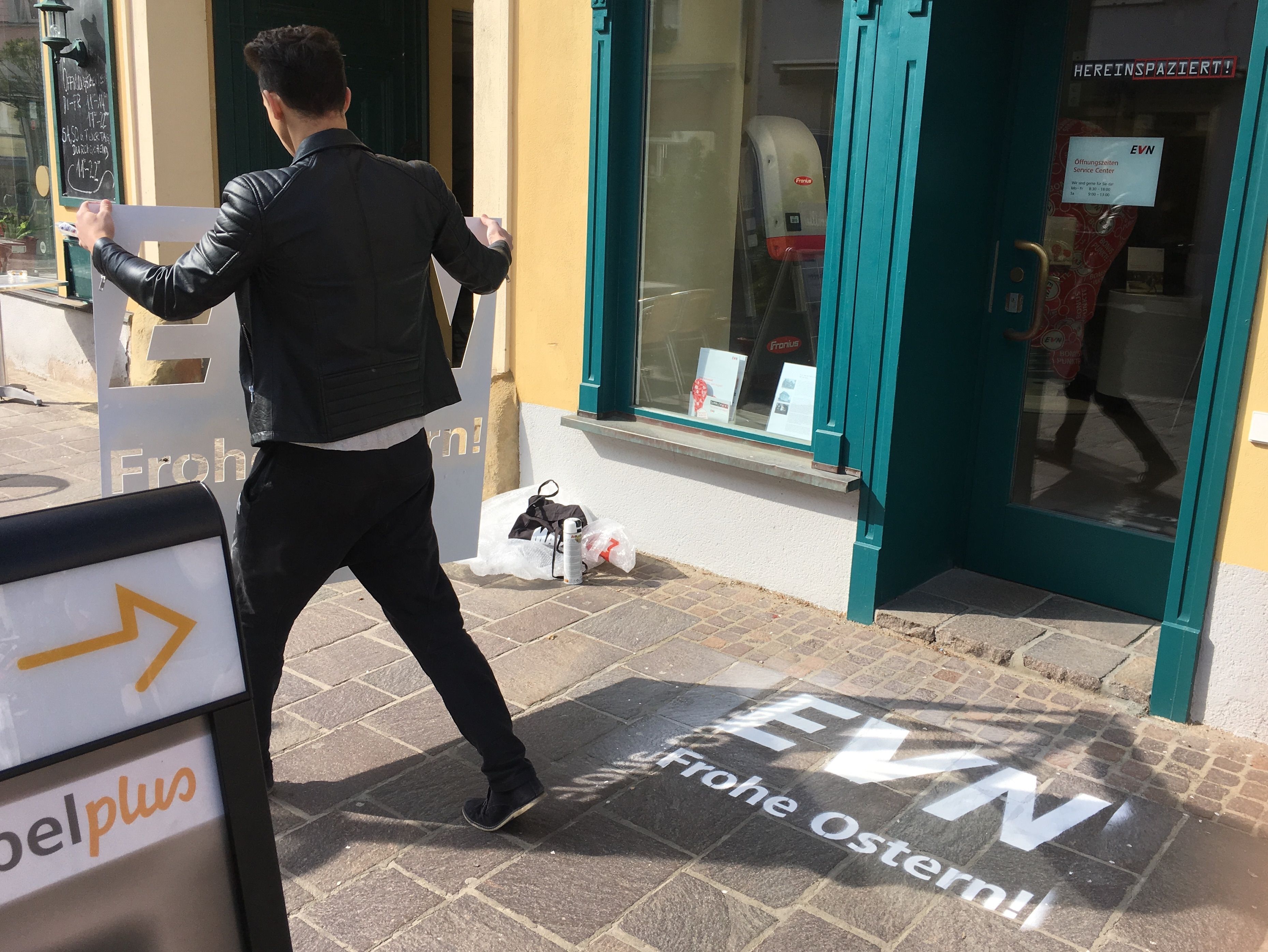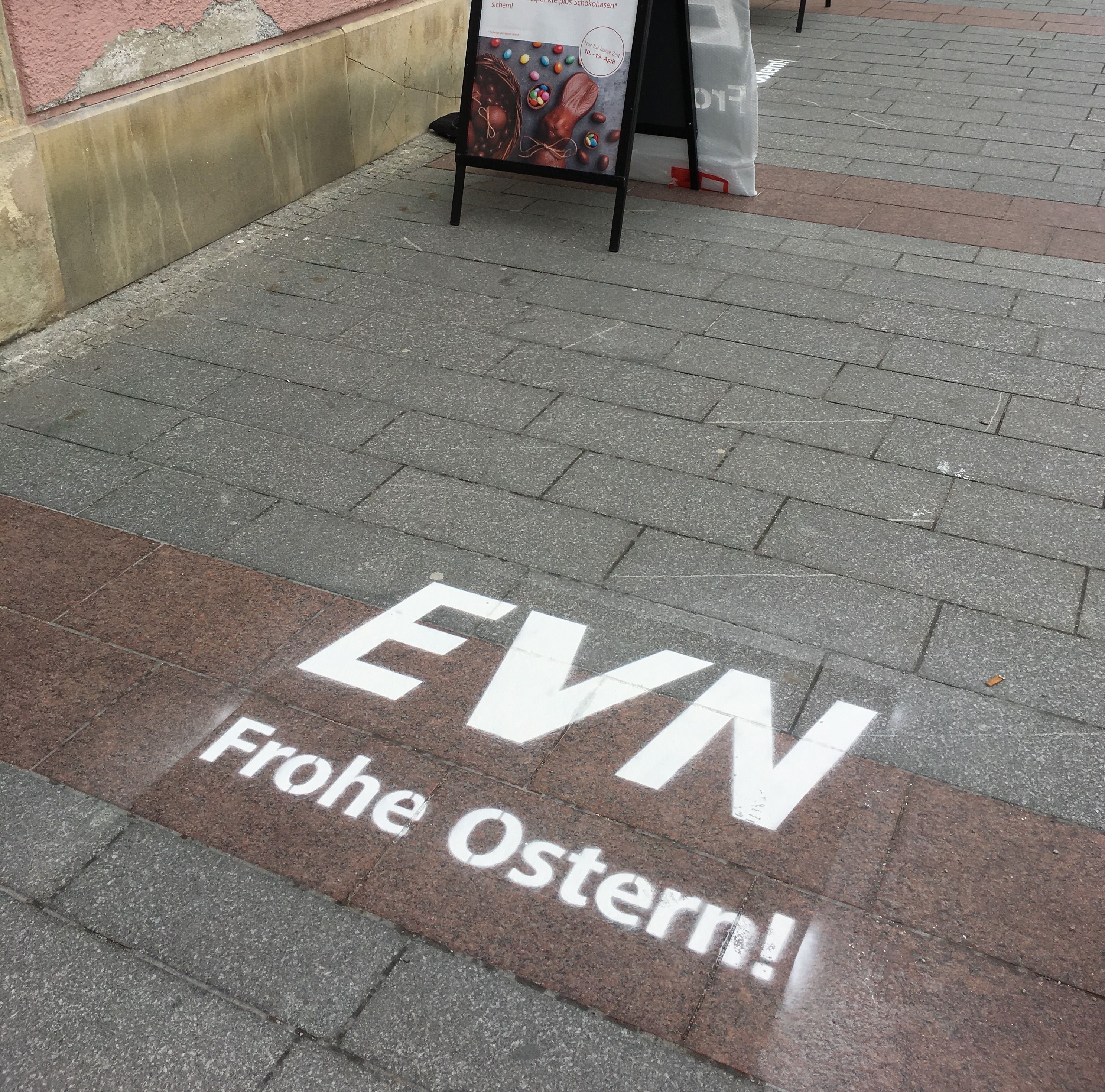 Frohe Ostern! Kunde: EVN Jahr: 2017 Aufgaben: Guerilla Umsetzung, Low Budget, Outdoor, Promotion, Sonderwerbeform, Streetbranding Ob bei Shop-Eröffnungen, Events oder einfach nur als Eyecatcher. Streetbrandings sind vielseitig einsetzbar. So nützte die EVN das Streetbranding beispielsweise als Ostergruß an niederösterreichische Passanten. zurück